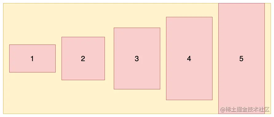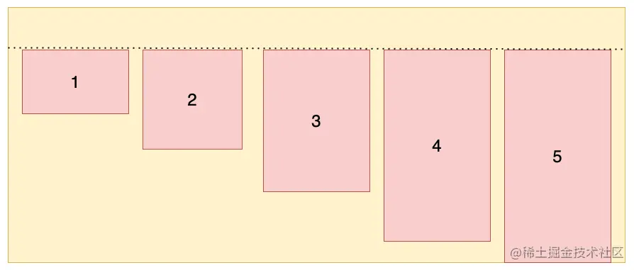 - align-item:flex-start:交叉轴的起点对齐(上面或左边)。设置容器高度为 100px,项目高度分别为 20px、40px、60px、80px、100px,效果如图所示: