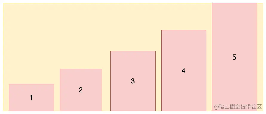 - align-item:flex-end:交叉轴的终点对齐(下面或右边)。设置容器高度为 100px,项目高度分别为 20px、40px、60px、80px、100px,效果如图所示: